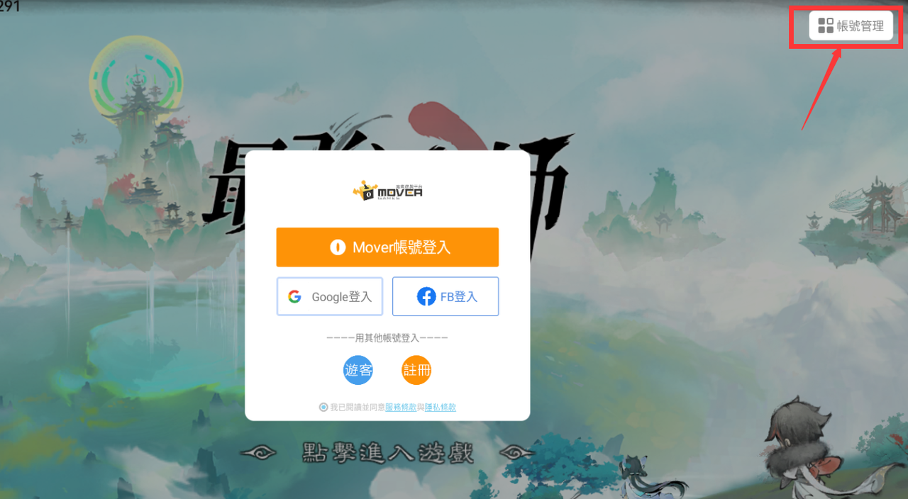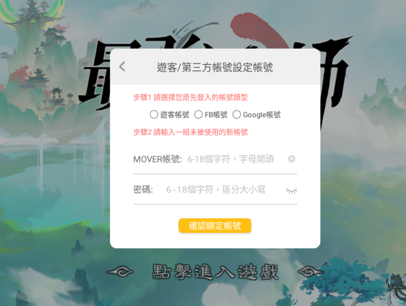 通過遊客帳號(Guest)、FB、Google、Apple ID等帳號登入遊戲的玩家,可以進行Mover帳號的設定,設定後可隨時使用Mover帳號代替遊客等方式進行登入遊戲。